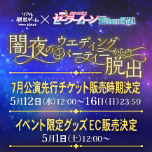 [2021/05/01]7月公演分のFC先行販売時期が決定&イベント限定オリジナルグッズEC販売スタート! 劇場版「美少女戦士セーラームーンEternal」とコラボレーションしたリアル脱出ゲーム『闇夜のウェディングパーティーからの脱出』
